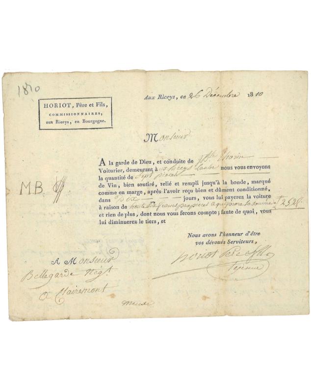 Connaissement voiturier 1810 - Transport de vin