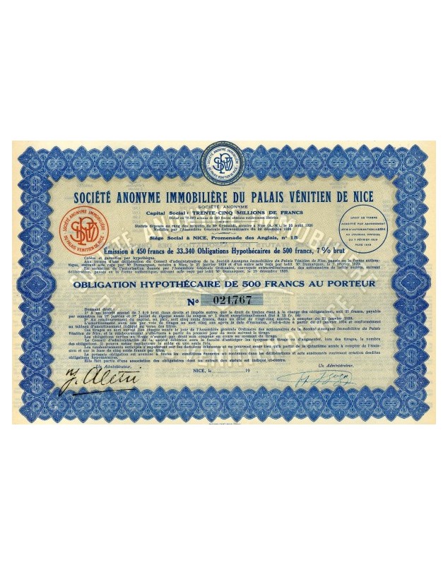 7% Mortgage Bond of 500F - Nice (Promenade des Anglais) unissued