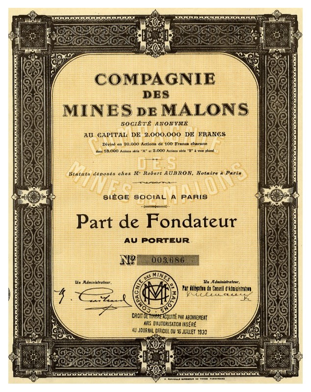 Founder share to bearer issued in Paris in 1930 by the Company of the Mines of Malons (Ardèche).