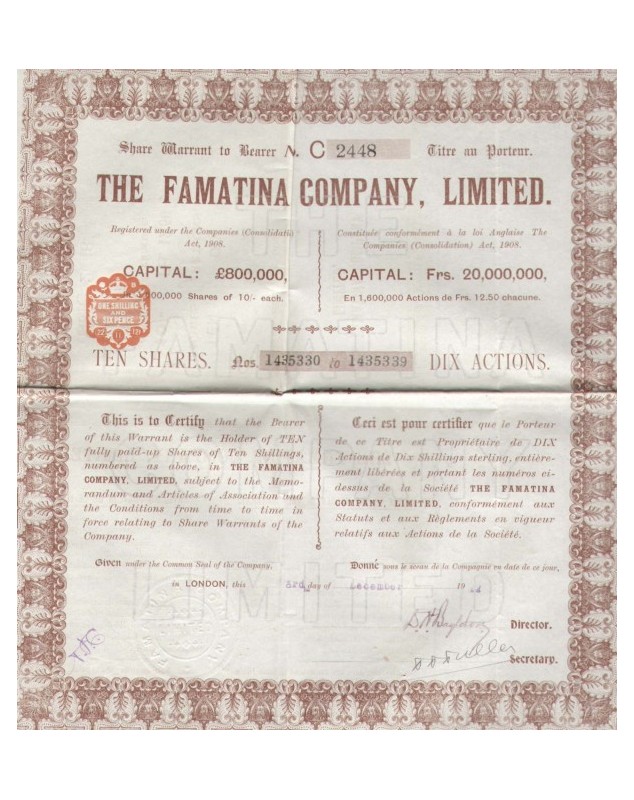 Certificate of 10 Shares of 10 Shilling each - London 1912