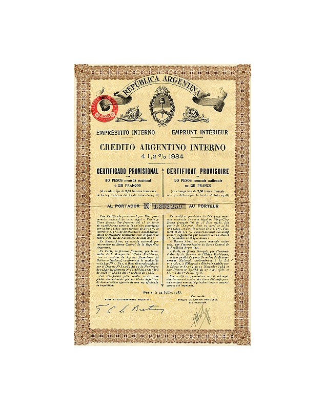 Credito Argentino Interno - Emprestito Interno 4.5% 1934