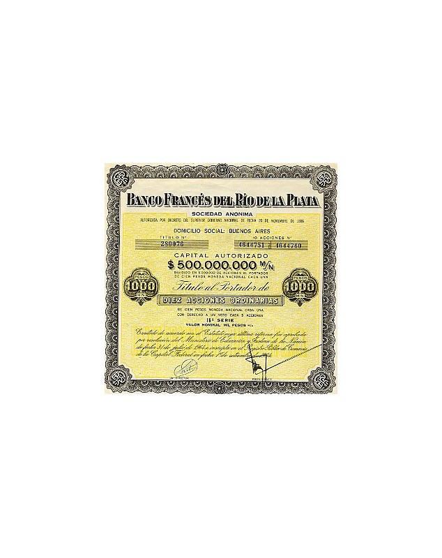 Certificate of 10 shares of 100 Pesos - Buenos Aires 1886