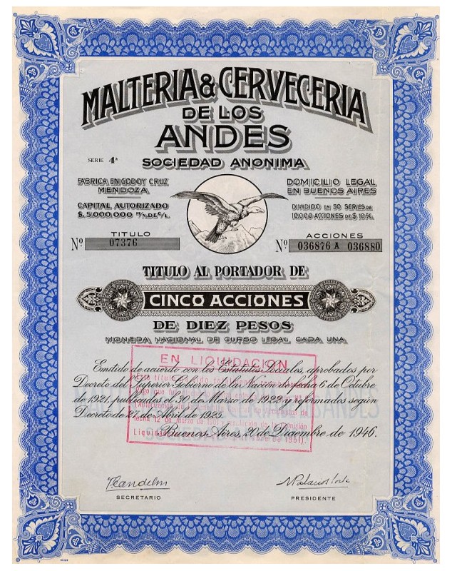 Certificate of 5 shares of 10 Ps. - Buenos Aires 1946