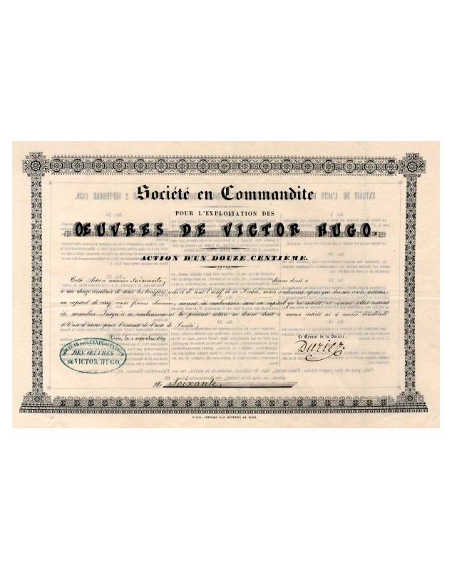Victor Hugo signed up to this company for 10 years, initially with the publisher Delloye who went bankrupt after 3 years, then with Duriez (whose signature appears on the share).