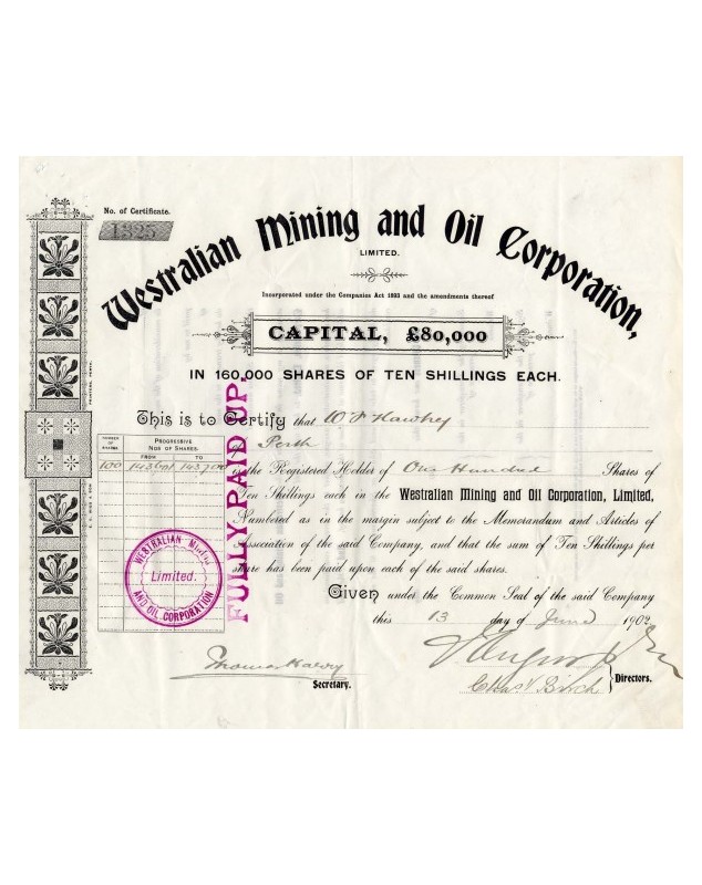 Cert. of 100 shares of 10 sh. ea. Perth 1902