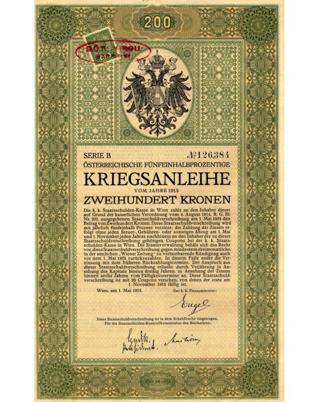 5.5% Bond of 200 Kronen Serie B issued in Wien in 1915.