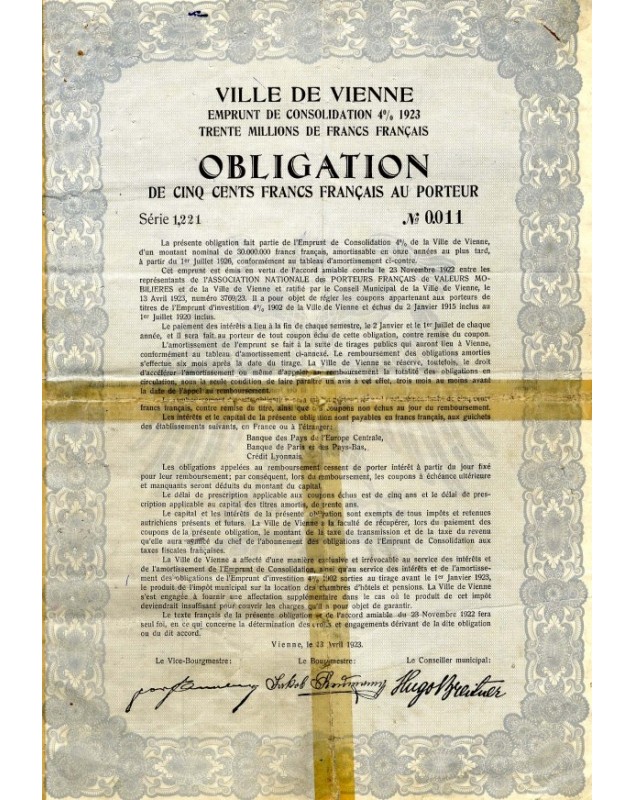 4% Bond of 500 French Francs issued in Wien in 1923.