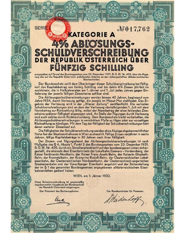 Bond of 50 Schilling ti the bearer issued in Wien in 1932.