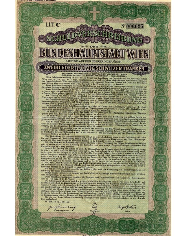 Schuldverschreibung der Bundeshaupstadt Wien, City of Wien Loan 1931