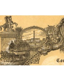 Superbe décor illustré du blason de la ville de Paris et des monuments parisiens : Notre-Dame, Arc de Triomphe, Bourse de Paris, Porte Saint-Denis, Invalides, Tuileries, Colonne de la Bastille, etc. ainsi que de voitures à cheval.