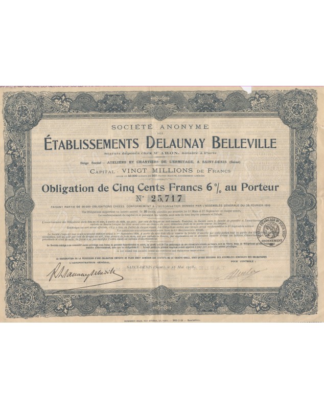With signature of Robert Delaunay Belleville, who was also a director of the Compagnie Française du Caoutchouc.