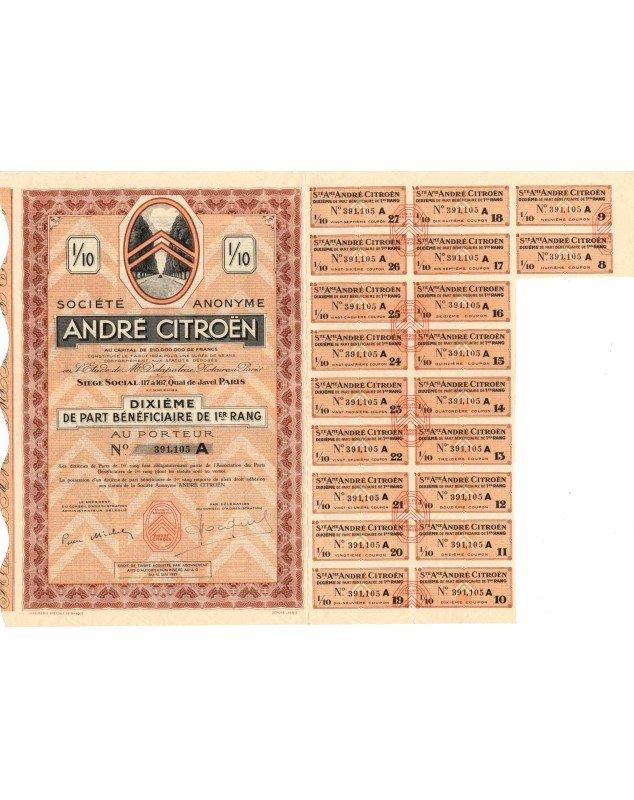 1/10th of Beneficiary Share 1sr row, Serie A, issued in 1937 in Paris, 117-167 Quai de Javel.