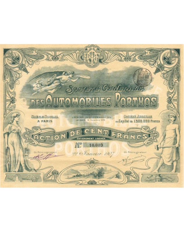 Share to bearer of 100 francs issued in Paris in 1907 by Société Générale des Automobiles Porthos, founded in 1905 in Billancourt (Boulogne) near Paris (12 rue du Dôme). The company made luxury cars.