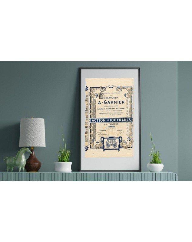 The company had a capital composed of 4000 shares. The large format title is decorated with a car in the Art Nouveau style by J. Pigmarre