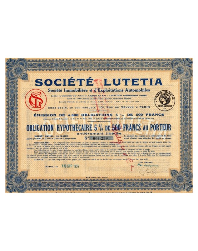 Bond 5% of 500F - Paris 1932