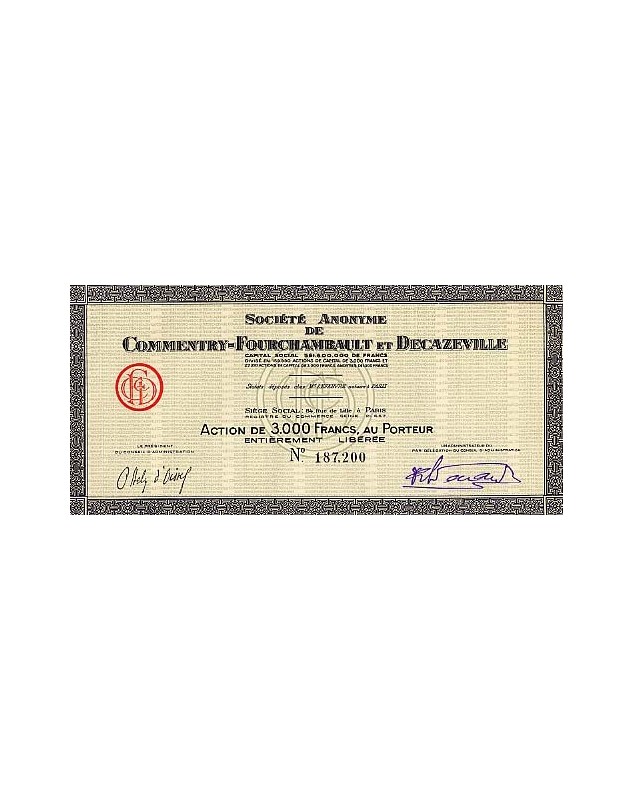 Bearer share of 3000 francs issued in Paris by the limited company Commentry-Fourchambault & Decazeville, composed of Houillères de Decazeville and Brassac, and Forges, Fonderies, Aciéries de Decazeville, Tarascon-sur-Ariège, Montluçon, Pamiers & Imphy .