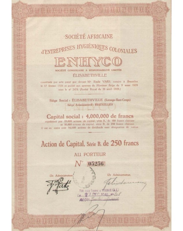 Share ''B'' of 250 Francs - Elisabethville/Bruxelles 1928
