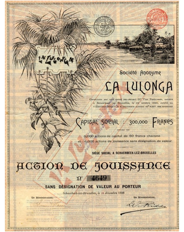 The limited company founded in 1898 had as its object the cultivation and exploitation in the Congo of plant products such as tobacco, coffee, cocoa, rubber, coconut palms and others.