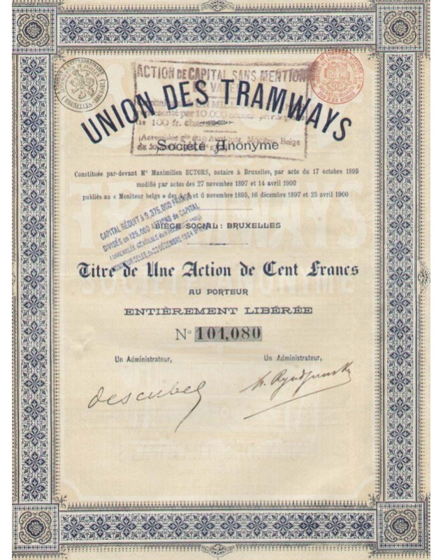 Cert. of 1 Share of 100F - Brussels 1900