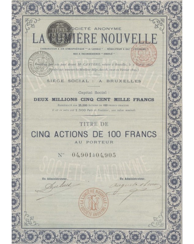 Cert. of 5 shares of 100F - Bruxelles 1895