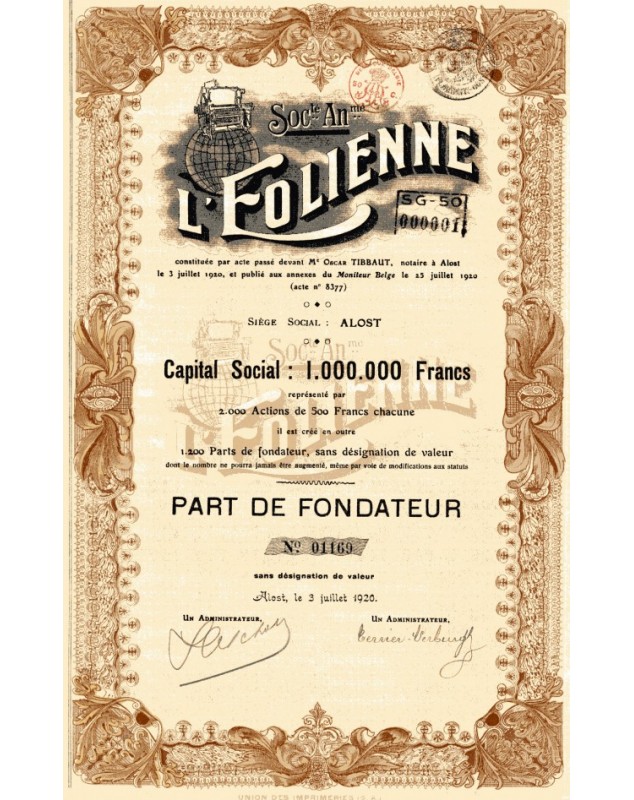 The company purpose was the manufacture and trade of cotton and silk linings. Illustrated with a globe topped with a weaving machine.