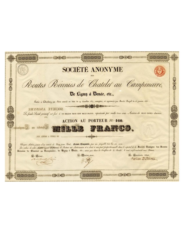 Share to bearer of 1000 francs issued in Charleroy in 1838.