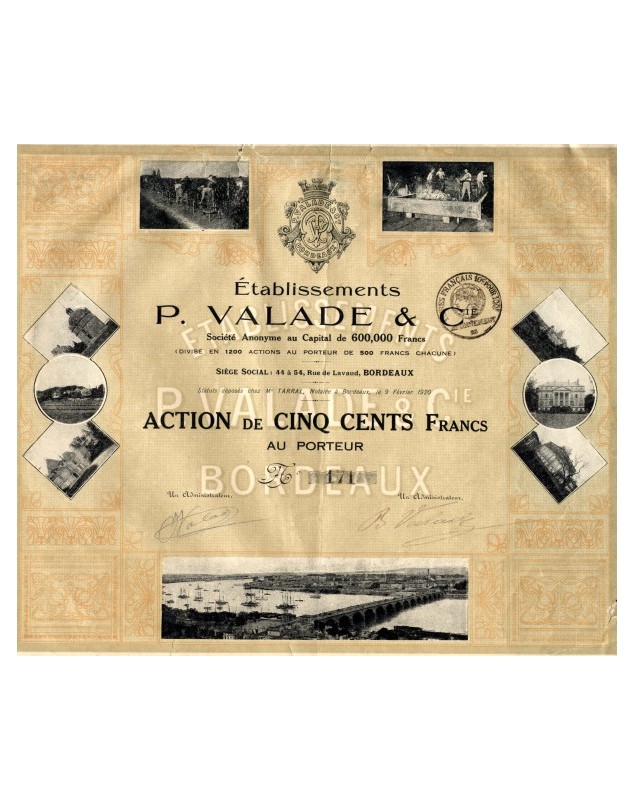 Action of 500 francs issued in Bordeaux in 1920. Signed by two members of the Valade family.