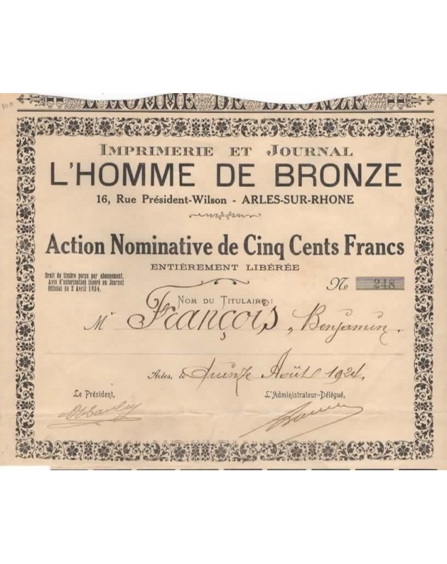 Nominal share of 500f - Arles-Sur-Rhone 1924