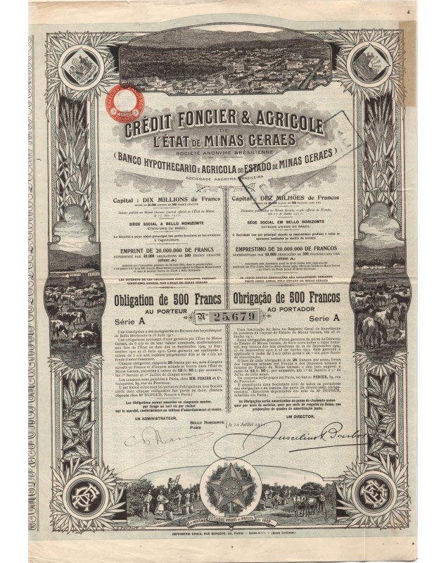 Bond of 500F Serie A - Bello Horizonte/Paris 1911