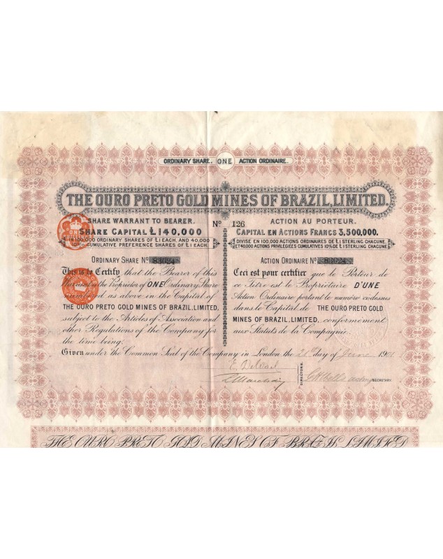 The Ouro Preto Gold Mines (meaning black gold) are one of the oldest gold mines in Brazil in the Minas Geraes, gold mining center in Brazil. The company was founded in 1884.