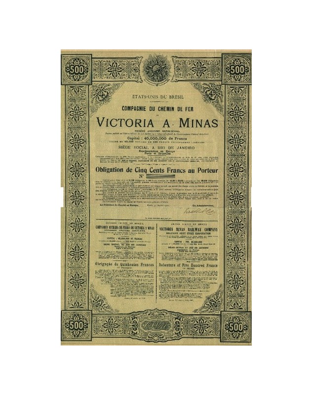 The purpose of the company was the construction and operation in Brazil of the railway line from Victoria (State of Espirito Santo) to Diamantina (State of Minas Geraes) and two other lines, one going from Santa-Anna dos Ferros to Itabira do Matto-Dentro and the other from Curralinha to Diamantina. The Brazilian government granted the Company a thirty-year guarantee of 6% on a capital corresponding to a maximum of 85,050 francs per kilometre. Since 1914, the Brazilian government has never paid the guarantee.