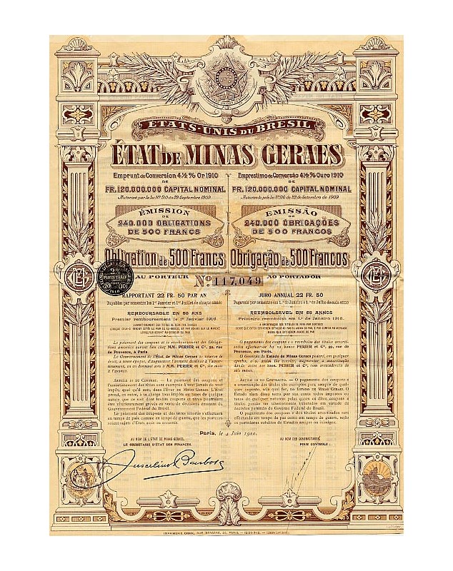 Title signed by the Secretary of State for Finance on behalf of the State of Minas Geraes.