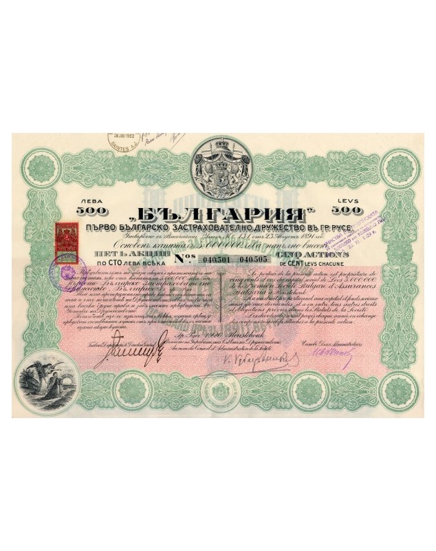 Certificate of 5 shares of 100 Levs each issued in Routschouk, Bulgaria, in 1926.