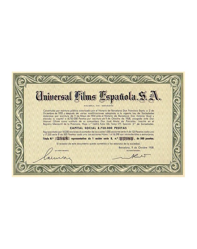 Certificate of 1 Share of 500 Pesetas - Barcelone 1958