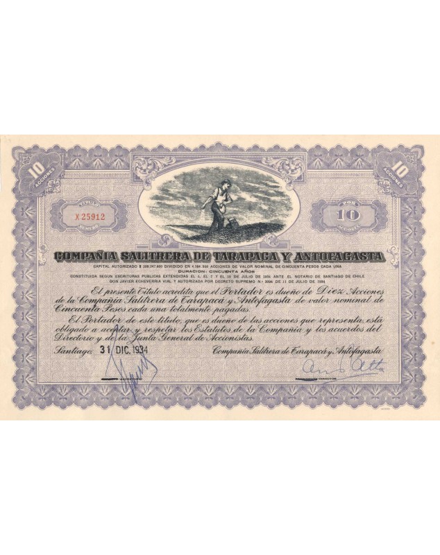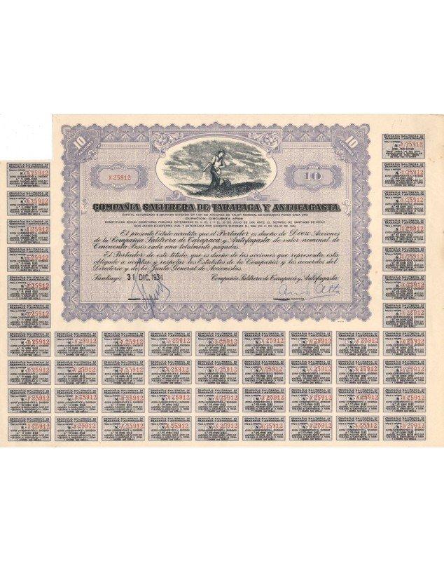 Certificate of 10 Shares of 50 Pesos each - Santiago 1934 or 1937