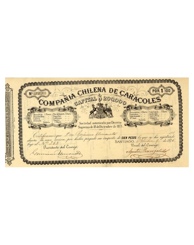 Cert. of 1 share of 100 Pesos - Santiago 1875