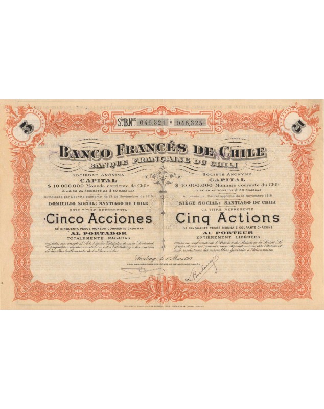 Certificate of 5 Shares to bearer of 50 Pesos each issued in Santiago 1917.