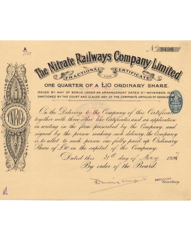 Certificate of 1/4 of 10£ Share issued in 1927.