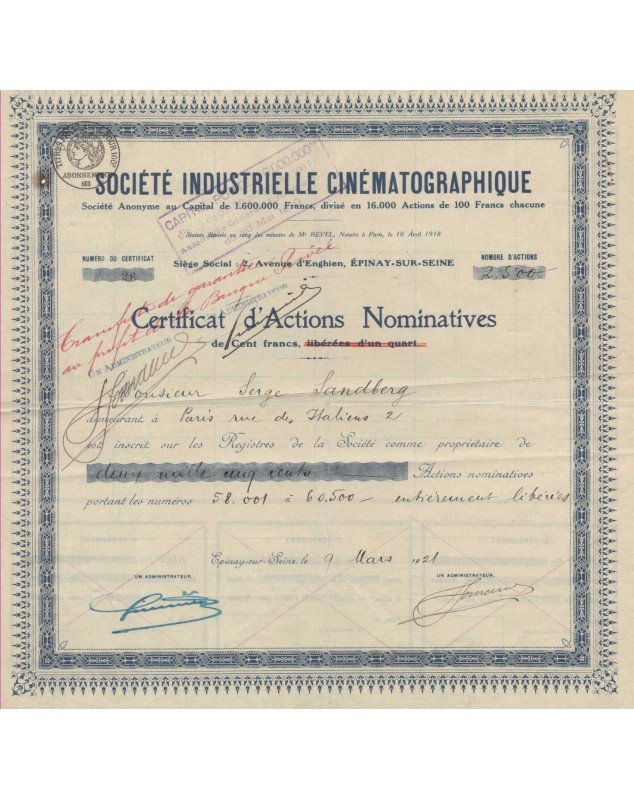 Share Certificate of 100F - Epinay S/Seine 1921
