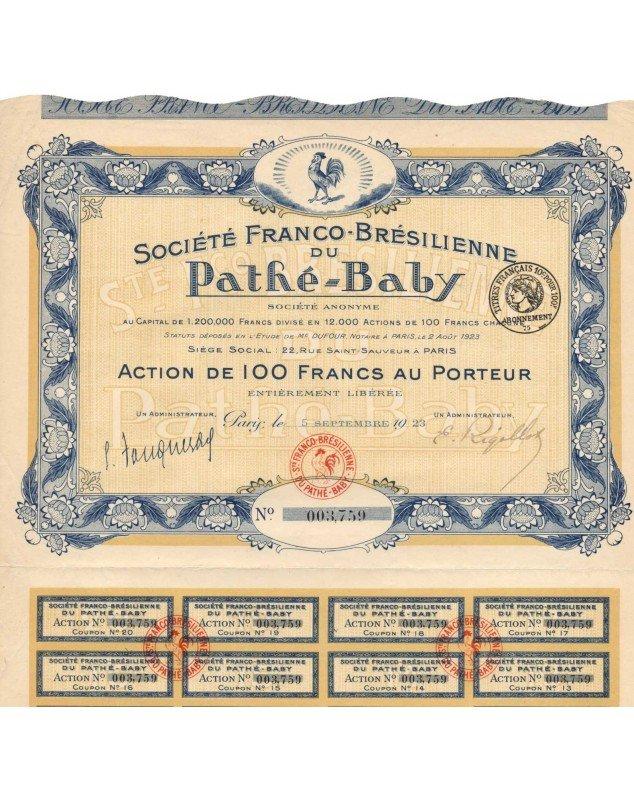 Share of 100 francs to the bearer issued in Paris in 1923. Illustrated with a rooster, emblem of the Pathé brand.
