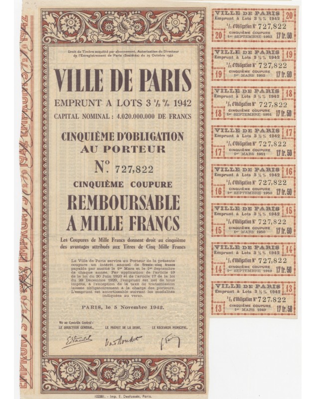 5th of a Bond of 1000F, 1st or 5th Coupure - Paris 1942