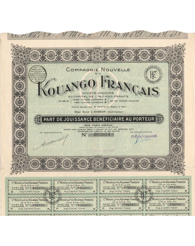 Shares issued in Paris in 1929. Headquarters in Bambari (Haut-Oubangui) 1929.