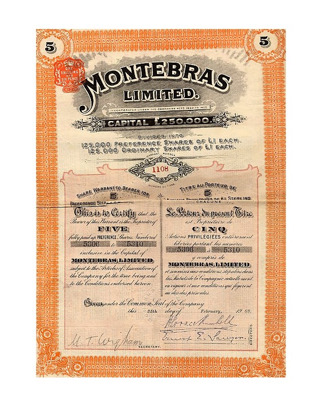 Certificate of 5 Priviledged Shares of 1£ each issued in 1908.