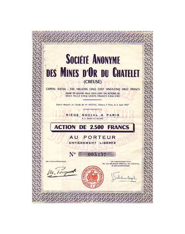 Share to bearer of 2500 francs issued in Paris in 1907.