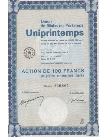 Bearer share of 100 francs issued in Paris in 1897. Head office and stores located in Paris, 5-8 Faubourg Saint-Antoine, near Place de la Bastille.