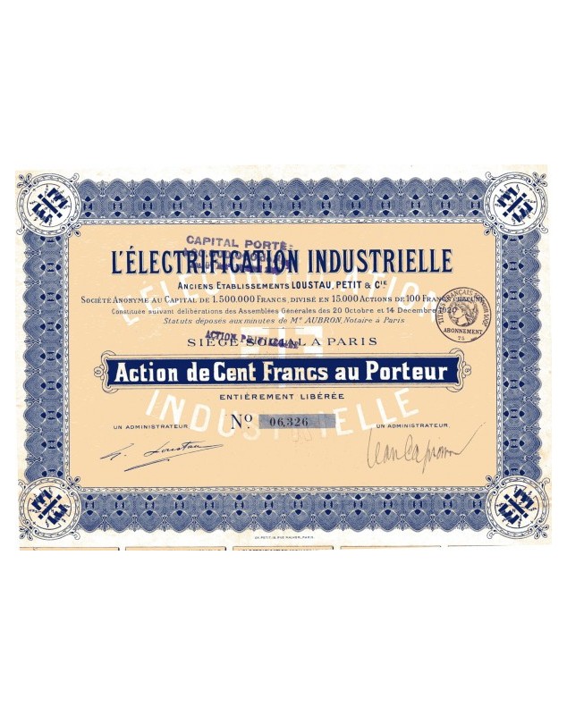 Signed on the left by Georges Loustau (1889-1970), electrical engineer from the École Bréguet in Paris and administrator delegate of L'Électrification Industrielle and of OCEA (Omnium Colonial d'Exploitations Agricoles).