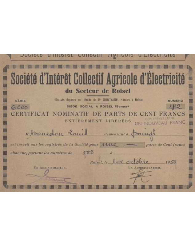 Certificate of 1 nominal share of 100F - Roisel 1959