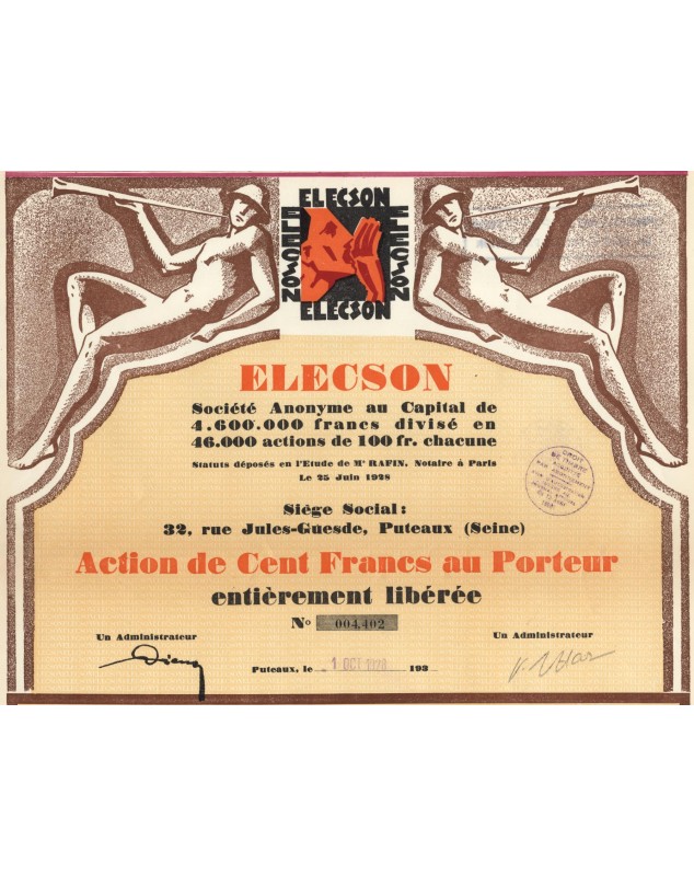 Superb illustration of a rather rare style for a French action. The object of the company was the manufacture of tubes, the purchase, rental, and sale of all phonographic devices, wireless telegraphy and electricity.