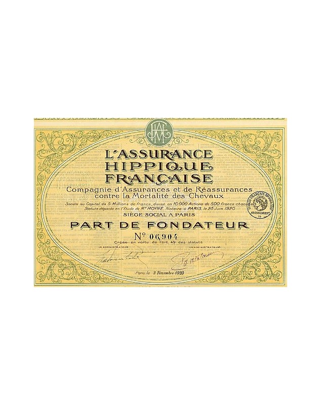 General insurances L'Assurance Hippique Française. Cie d'Assurances et de Réassurances contre la Mortalité des Chevaux€80.00