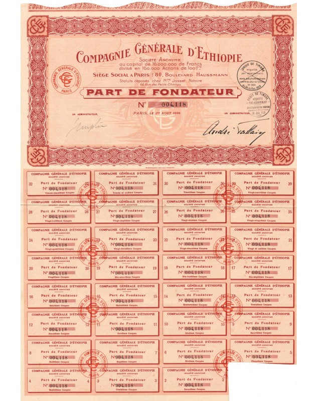 Compagnie Générale d'Ethiopia was set up in 1927 with largely French capital. Initially a simple study company, with a capital of 2 million, it then increased its capital to 16 million francs.